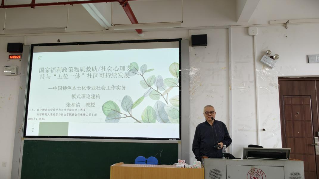 为深化学生对社会工作本土化理论与实践的理解,11月4日下午,我院社会工作系特邀华南农业大学社会工作学科首席专家、中山大学社会学与社会工作系教授、博士生导师张和清教授开展专题讲座。张教授以“国家福利政策物质救助/社会心理支持与‘五位一体’社区可持续发展——中国特色本土化专业社会工作服务模式理论建构”为主题,在文综415教室为学院师生带来一场内容丰富、见解深刻的学术讲座。