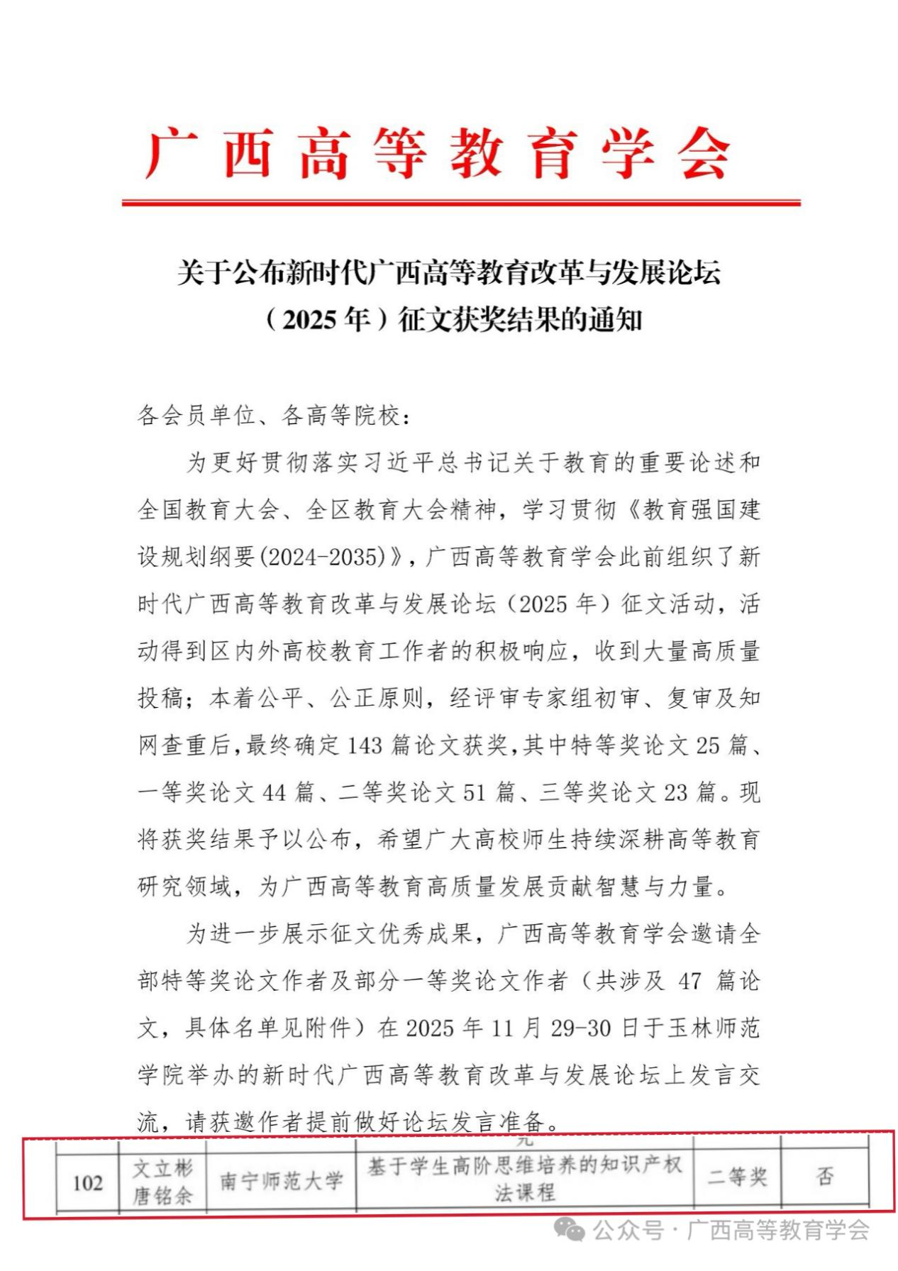 近日,广西高等教育学会公布了“新时代广西高等教育改革与发展论坛(2025年)”征文获奖名单,我院法律硕士研究生唐铭余与文立彬副教授合著的论文《基于学生高阶思维培养的知识产权法课程》从众多参赛作品中脱颖而出,荣获二等奖。该篇论文围绕知识产权法课程在教学理念、形式和评价等方面存在的问题,基于学生高阶思维培养的目标,提出针对性地优化路径,回应了当前高等教育提质升级的迫切需求。