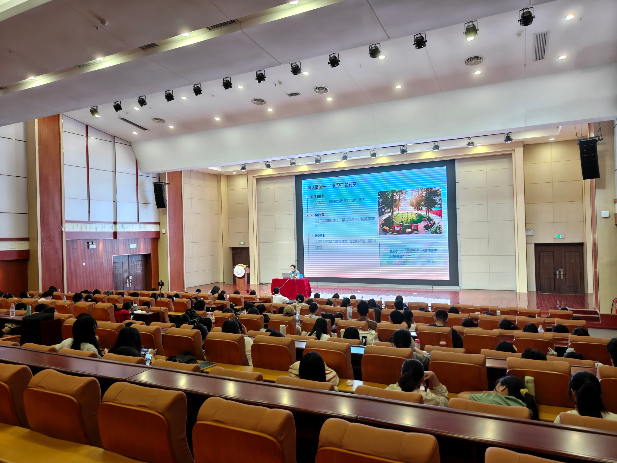 本次报告会采用专题研讨形式,邀请五位专家作主题发言。广州大学台山附属中学校长、数学正高级教师杨勇文以《积极心理学视域下的学校成长型思维培育》为题,结合自身教育实践与学术研究,深入探讨了积极心理学赋能学校发展、培育学生成长型思维的路径与方法;台山市台城第二小学党总支书记、小学英语高级教师黄泳虹围绕《成长不设限——从教师到校长的成长之路》,分享了自身从一线教师到学校管理者的成长历程与经验感悟,为青年教师职业发展提供了宝贵借鉴;开平市三埠达德小学校长李杨威以《AI狂潮下,未来的教师如何适应》为题,分析了人工智能时代对教师素养提出的新要求,探讨了教师应对技术变革、实现专业转型的策略;台山市骨干教师、初中数学高级教师苏惠文带来《五雅立德 打造乡村优质教育》专题分享,聚焦乡村教育发展,阐述了以“五雅”德育为核心打造乡村优质教育的实践探索;台山市新宁小学副校长朱红燕以《秉文学金钥,入史家之门——面向师范生的文史跨学科教学的实践与探索》为题,结合文史跨学科教学案例,为师范生开展跨学科教学提供了实践指引。五位专家的发言紧扣教育领域的重点难点问题,观点鲜明、内容详实,引发在场师生热烈反响。