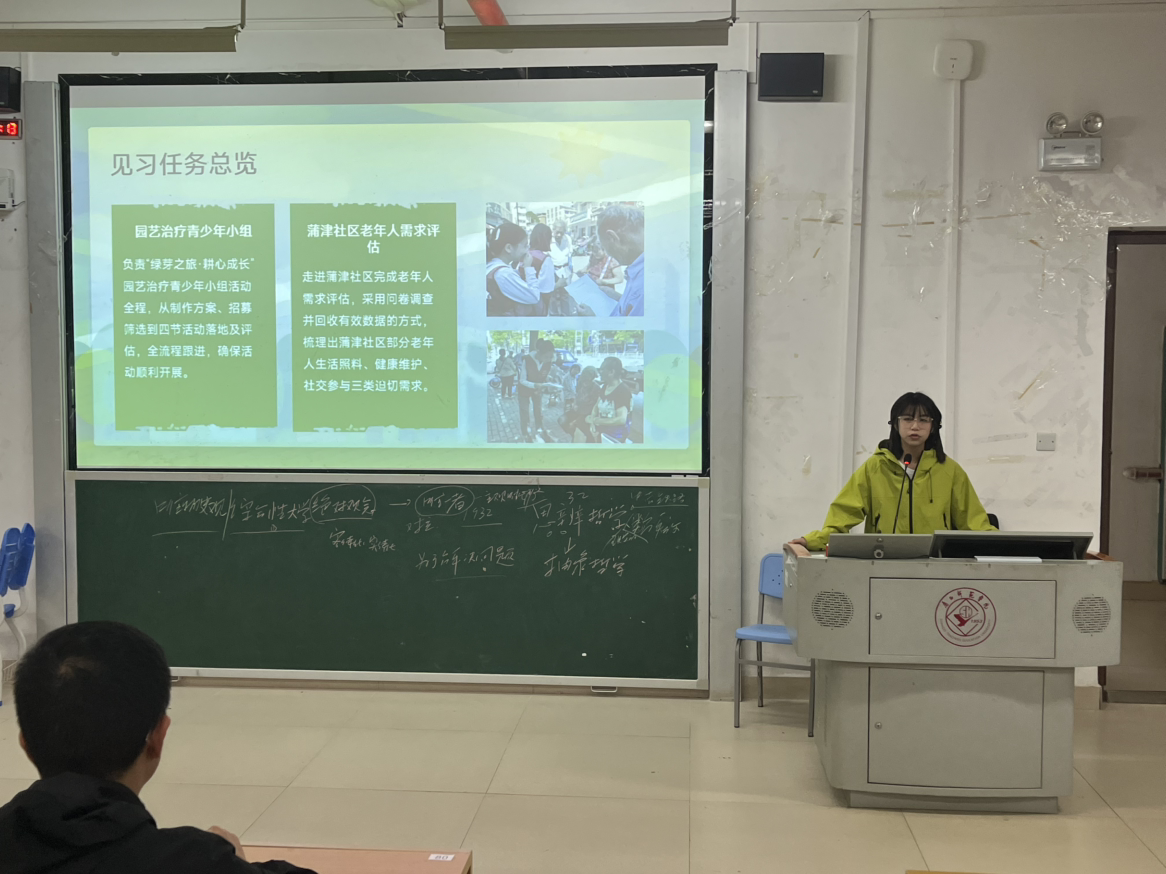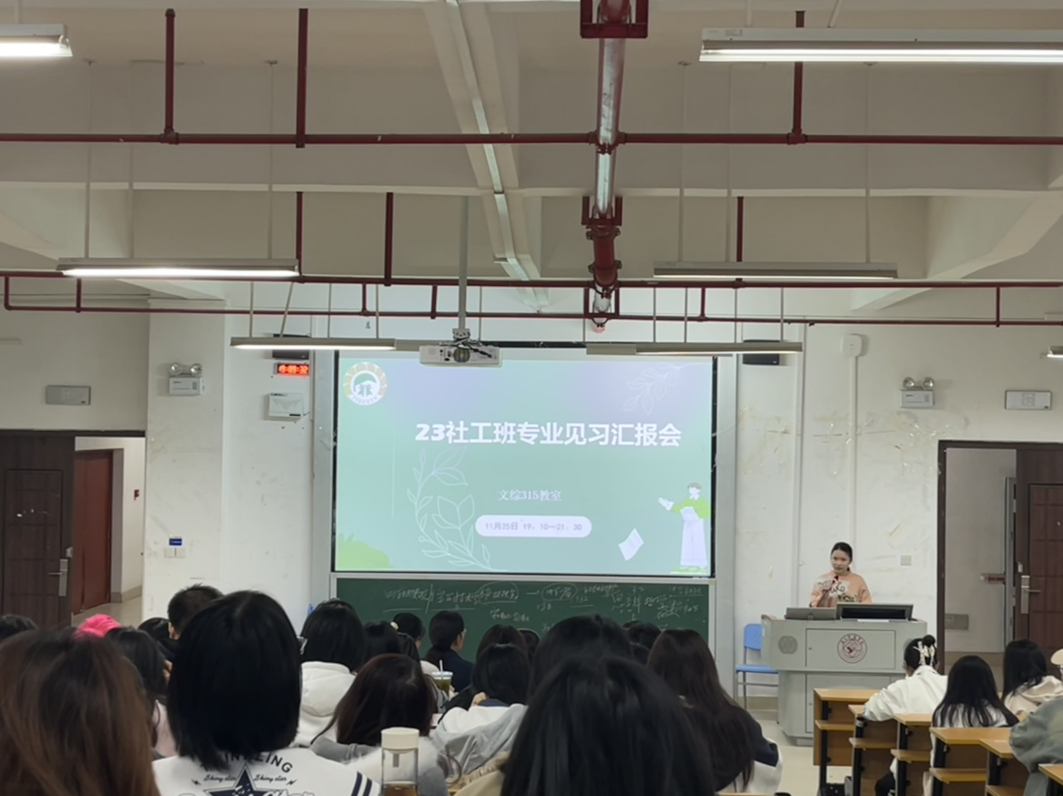 “以实践践真知,以爱心暖社会”,为深化社会工作专业学生对行业的认知,锤炼专业服务技能,法学与社会学院23级社工班见习汇报会在五合文综楼315顺利举行。本次见习于9月1日至10月10日开展,在专业指导老师的带领下,41名学生奔赴社区服务中心、养老机构、青少年活动基地等多个见习点,完成了一场理论与实践深度融合的成长之旅。