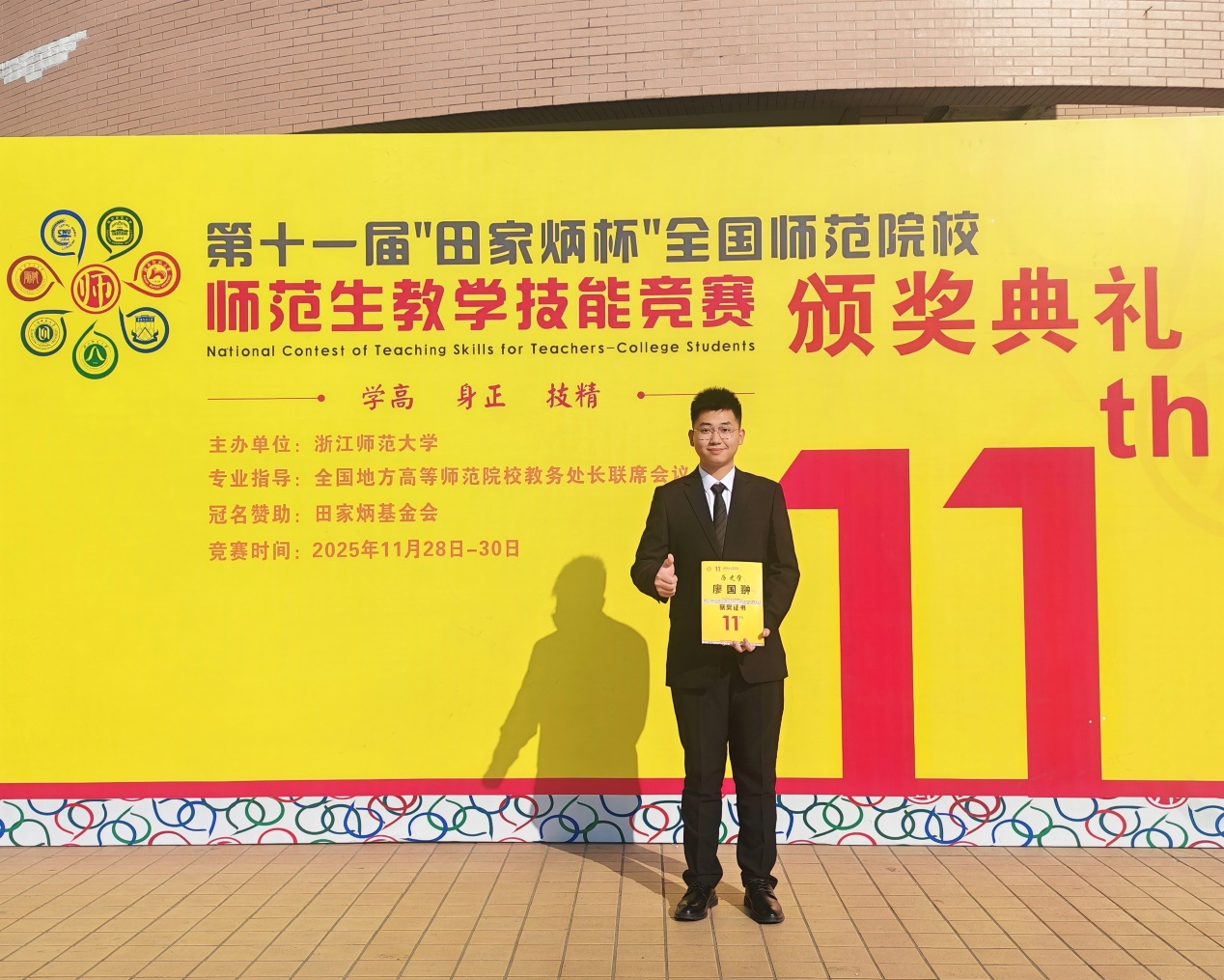 在刚刚结束的第十一届“田家炳杯”全国师范院校师范生教学技能竞赛决赛中,我院历史学本科专业2024级廖国翀同学荣获全国一等奖。