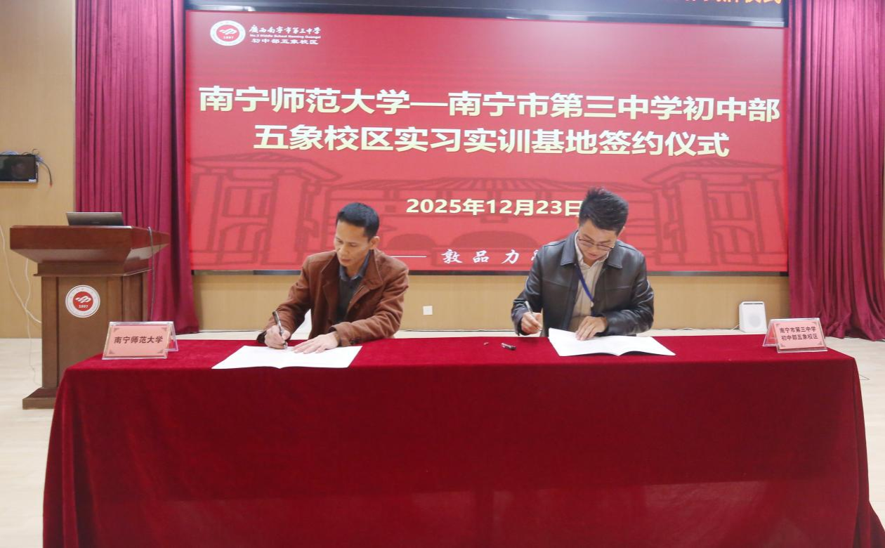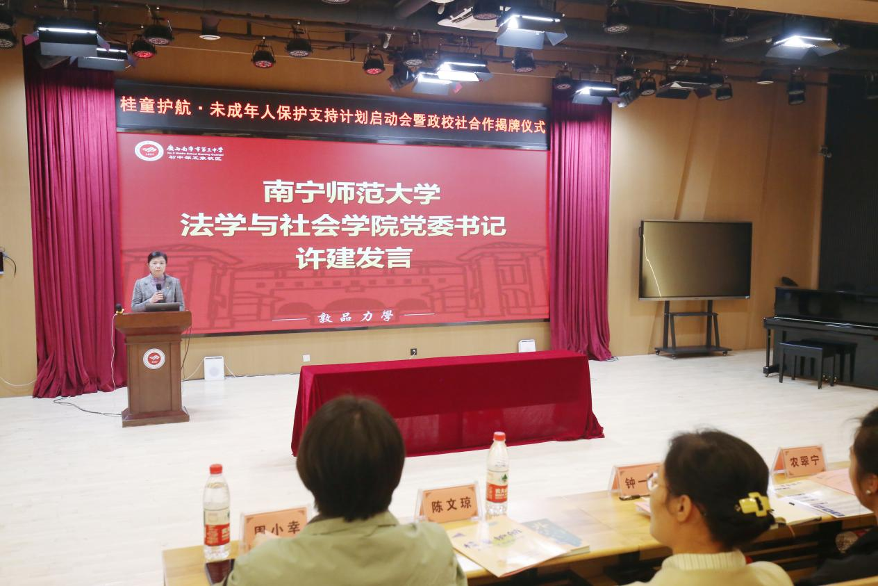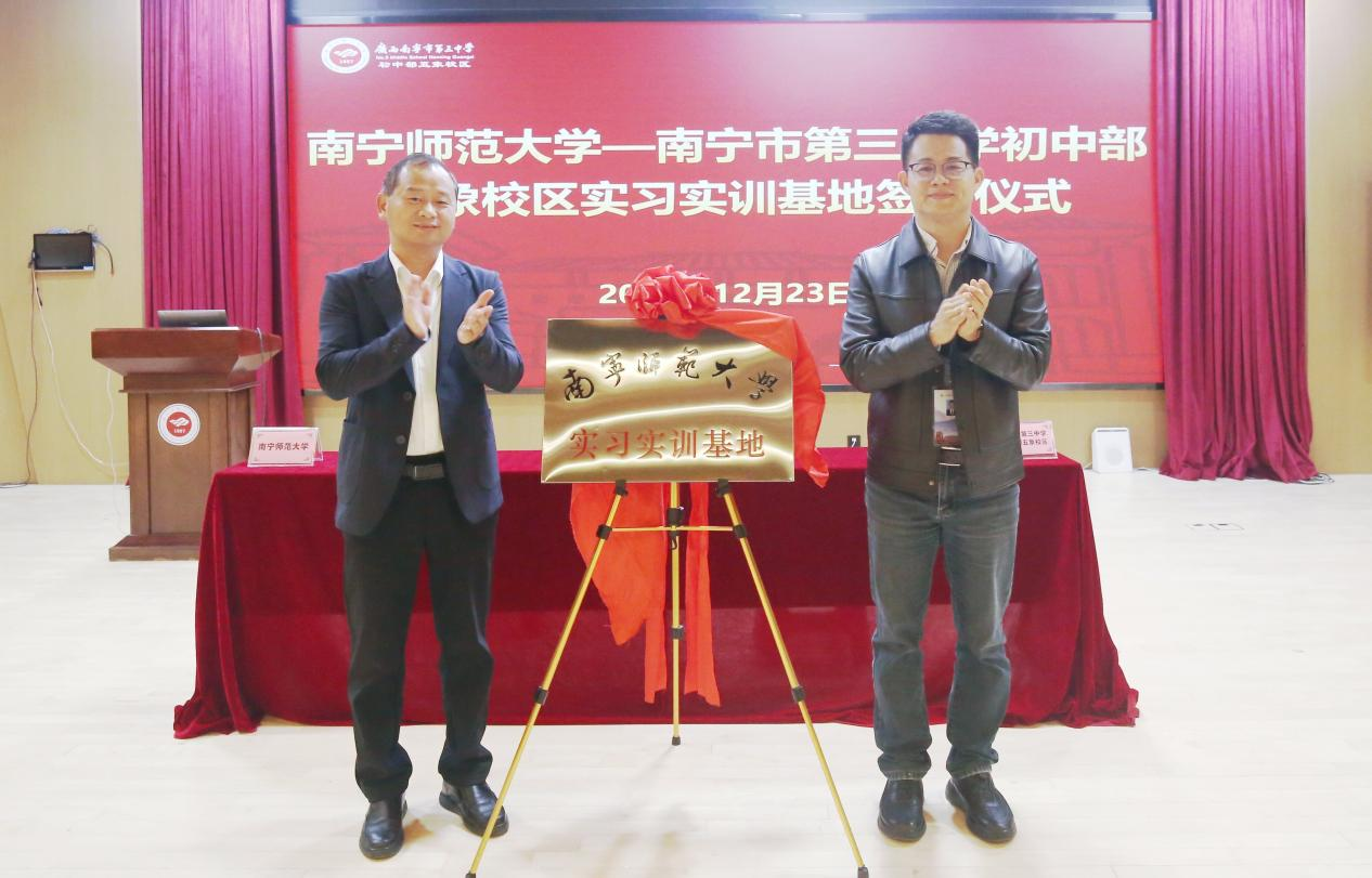 为深入贯彻落实党和国家关于未成年人保护工作的战略部署,推动社会工作专业力量深度服务基础教育一线,12月23日,“桂童护航·未成年人保护支持计划”项目启动会暨政校合作揭牌仪式在南宁市第三中学初中部五象校区举行。我院与南宁三中初中部五象校区现场签署共建实习实训基地协议,并同步揭牌。这标志着学院深度参与的“党政部门统筹指导、学校主责落实、社工机构专业服务、高校智力支持”四方联动协同育人机制正式启动运行。学院党委书记许建、主持行政工作的副院长吴少进、副院长罗永仕、院长助理陈文琼及社会工作系部分教师参加了本次活动。