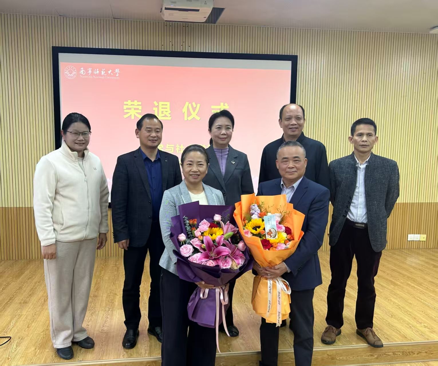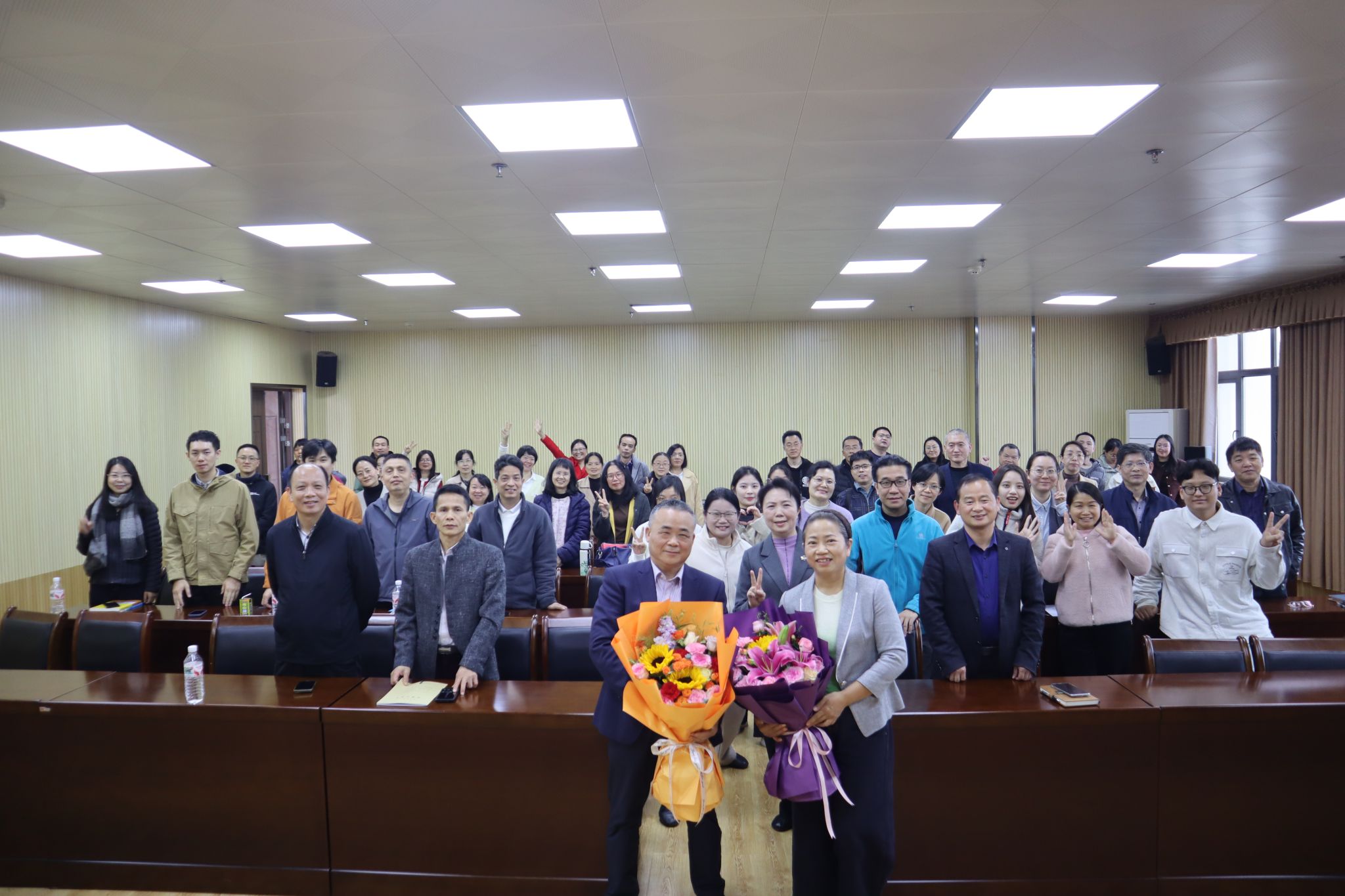 现场播放了荣退纪念短片,定格两位教师从教生涯的许多珍贵场景,两位荣退教师依次发言,饱含对教育事业的热爱与对学院的眷恋,感恩学院与同事的陪伴支持,持续心系学院发展。随后,学院领导为两位荣退教师献上鲜花,致谢他们的坚守、付出和贡献,祝愿他们荣退生活幸福安康、顺遂如意。最后,全体人员和着伴奏齐唱《这世界那么多人》,共忆同心耕耘的过往岁月,温情满溢,沁润人心。